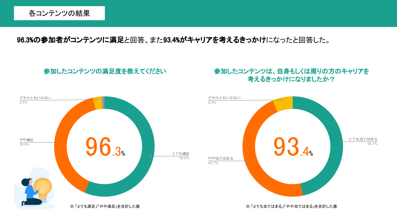 各コンテンツについて、96.3%の参加者がコンテンツに満足と回答、また93.4%がキャリアを考えるきっかけになったと回答しました。
