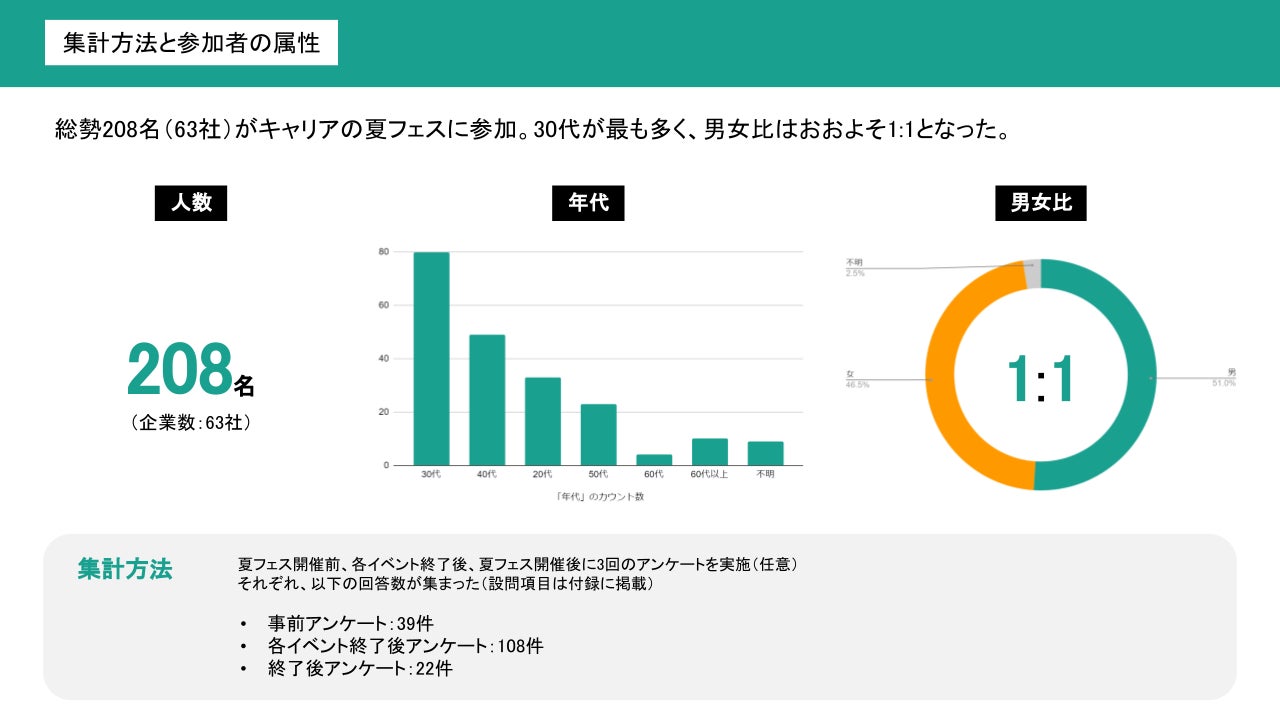 総勢208名(63社)がキャリアの夏フェスに参加。30代が最も多く、男女比はおよそ1:1となりました。