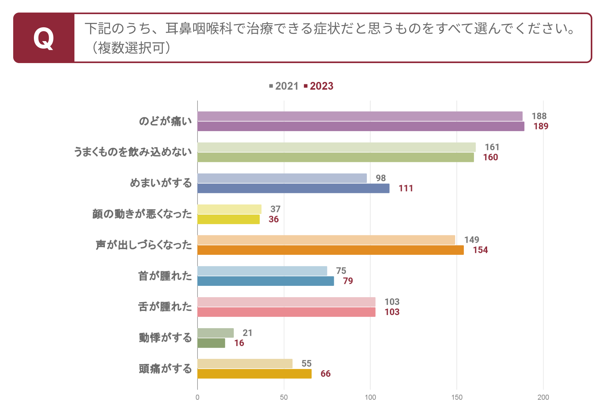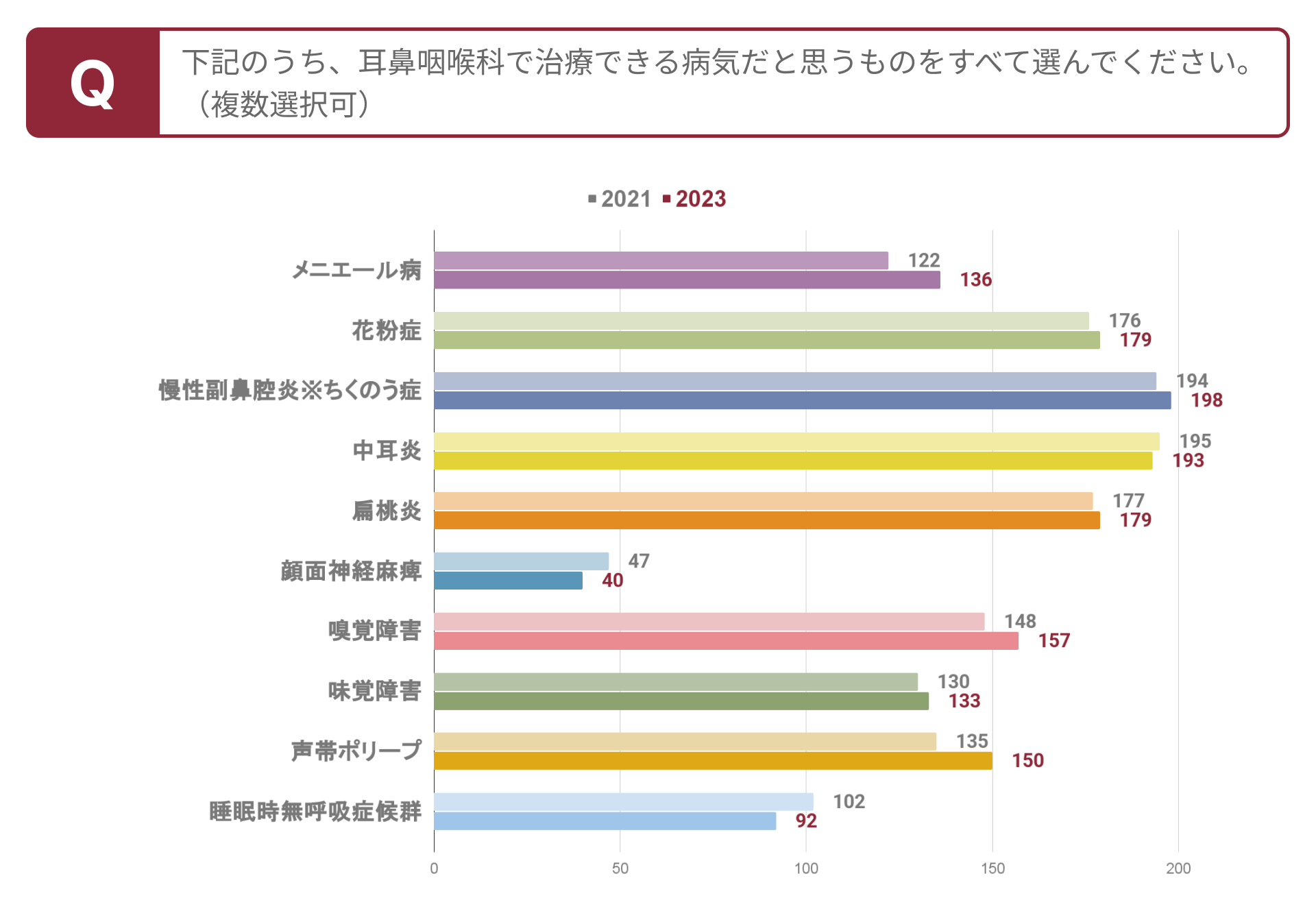 第2回調査と第1回調査のデータを比較したところ、全体を通して回答の傾向は大きく変化しておらず、耳鼻咽喉科で治療できる症状・病気に関する啓発活動の継続が必要であることが分かりました。一方、一部の設問からは特定の病気(声帯ポリープやメニエール病など)について耳鼻咽喉科で治療できると思うとする回答が増えており、耳鼻咽喉科の広範な担当領域について少しずつ認知が高まっている兆候がみられます。