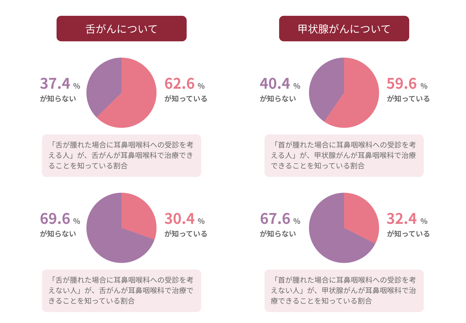 また、第1回調査同様、耳鼻咽喉科で治療できると思われる症状について質問した結果と照らし合わせると、舌が腫れたときに耳鼻咽喉科で治療できないと考える人のほうが、舌がんの治療ができることを知らない傾向にあることも分かった。同様に、首が腫れたときに耳鼻咽喉科で治療できないと考える人のほうが、甲状腺がんの治療ができることを知らない傾向にあった。