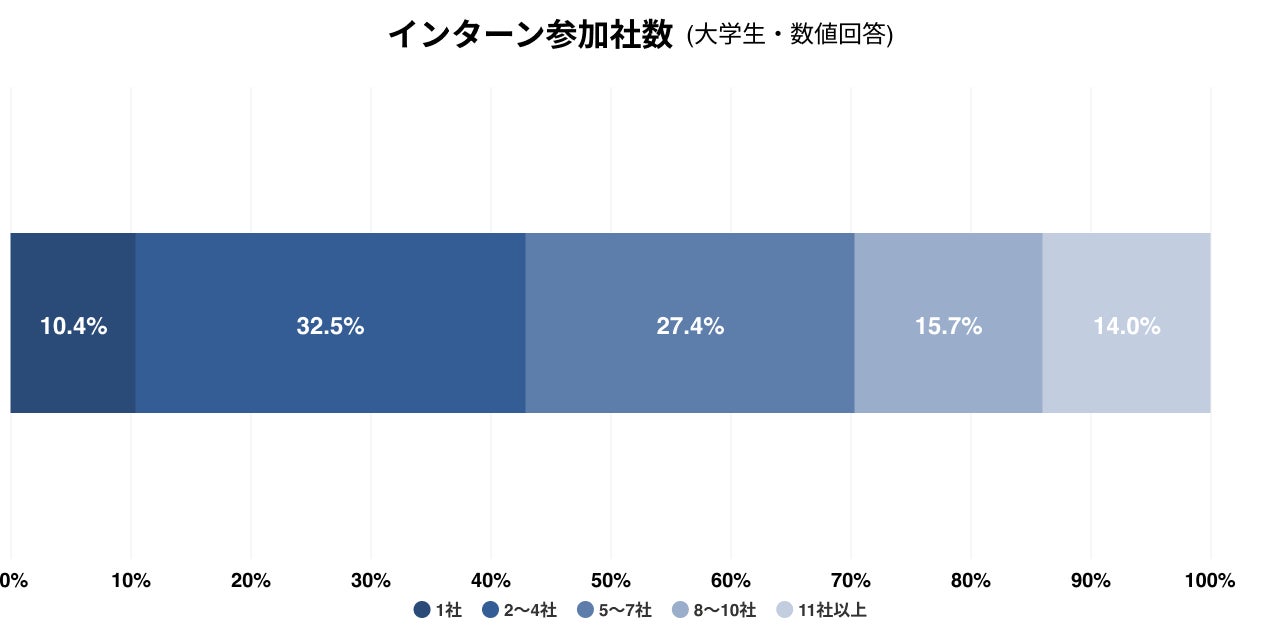 インターンシップへの参加率は非常に高く、また、複数社に参加している学生が多数を占める。平均で6.58社のインターンに参加しており、11社以上の経験を持つ学生も一定数確認できる。
