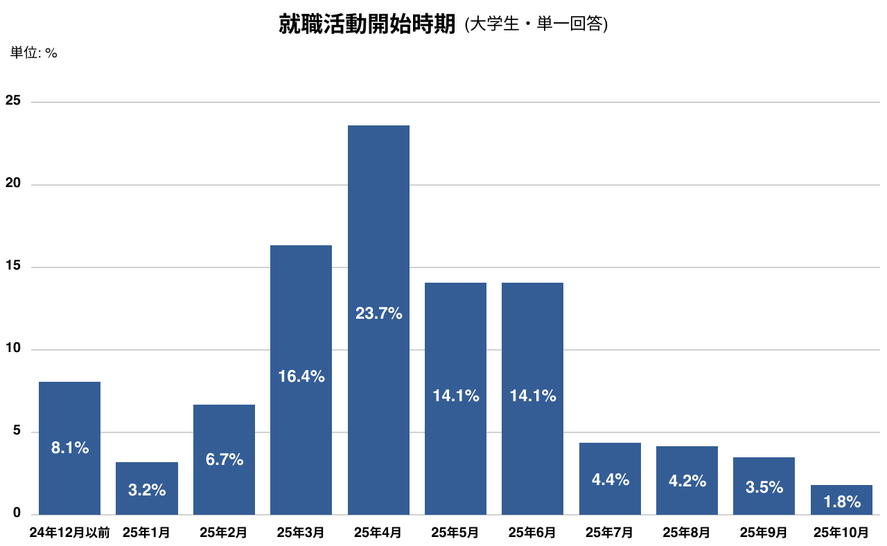 就職活動の開始時期を見ると、2年生以前に開始した割合(2024年12月以前~2025年3月までの合計)は34.4%。月別に見ると、最も多いのは3年生4月(2025年4月)であり、その前後の月に開始する学生も多い。