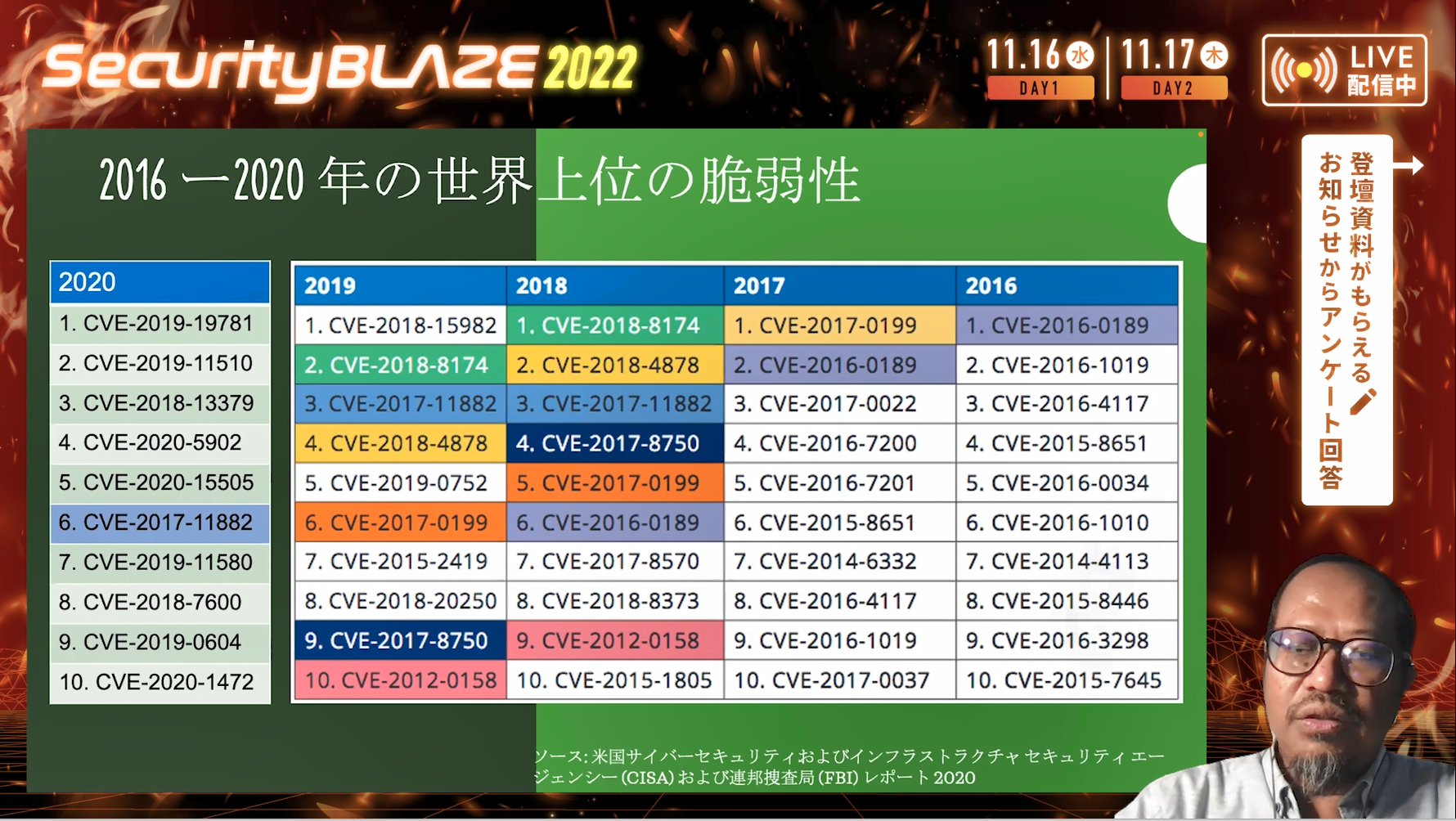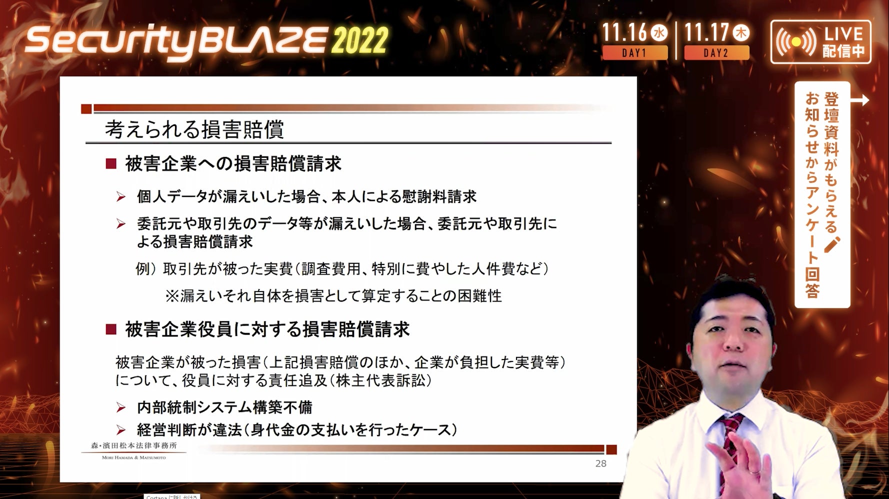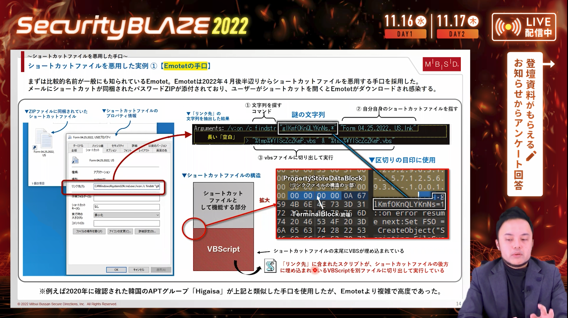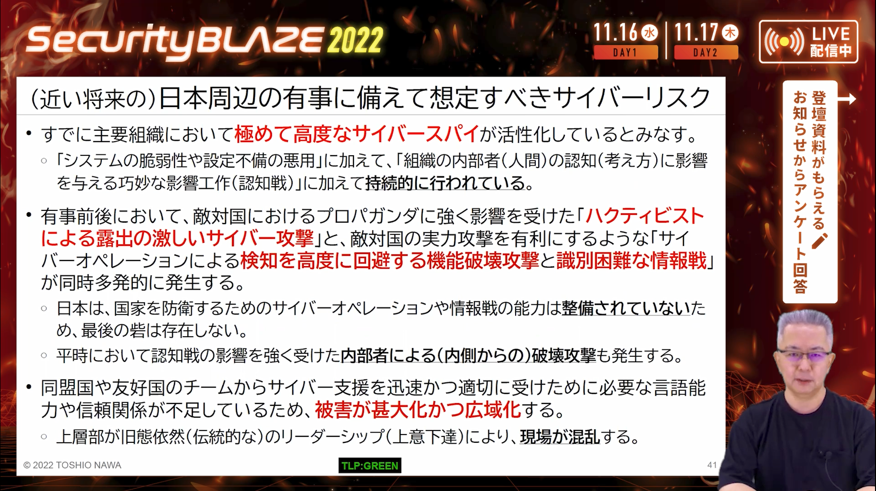 「Security BLAZE2022」は、日本を代表するサイバーセキュリティの専門家や企業にお集まりいただき、サイバーセキュリティの最新動向や脅威への対策などを中心にお話いただく、日本最大級のオンラインセキュリティカンファレンスです。2022年11月16日~17日の二日間にかけて開催した結果、当初の計画を大きく上回る約2,900名の方から参加お申し込みをいただき、大好評のうちに終了致しました。