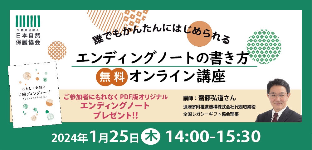 公益財団法人日本自然保護協会(理事長:亀山 章)では2024年1月25日(木)に、「誰でもかんたんにはじめられる エンディングノートの書き方オンライン講座」開催します。