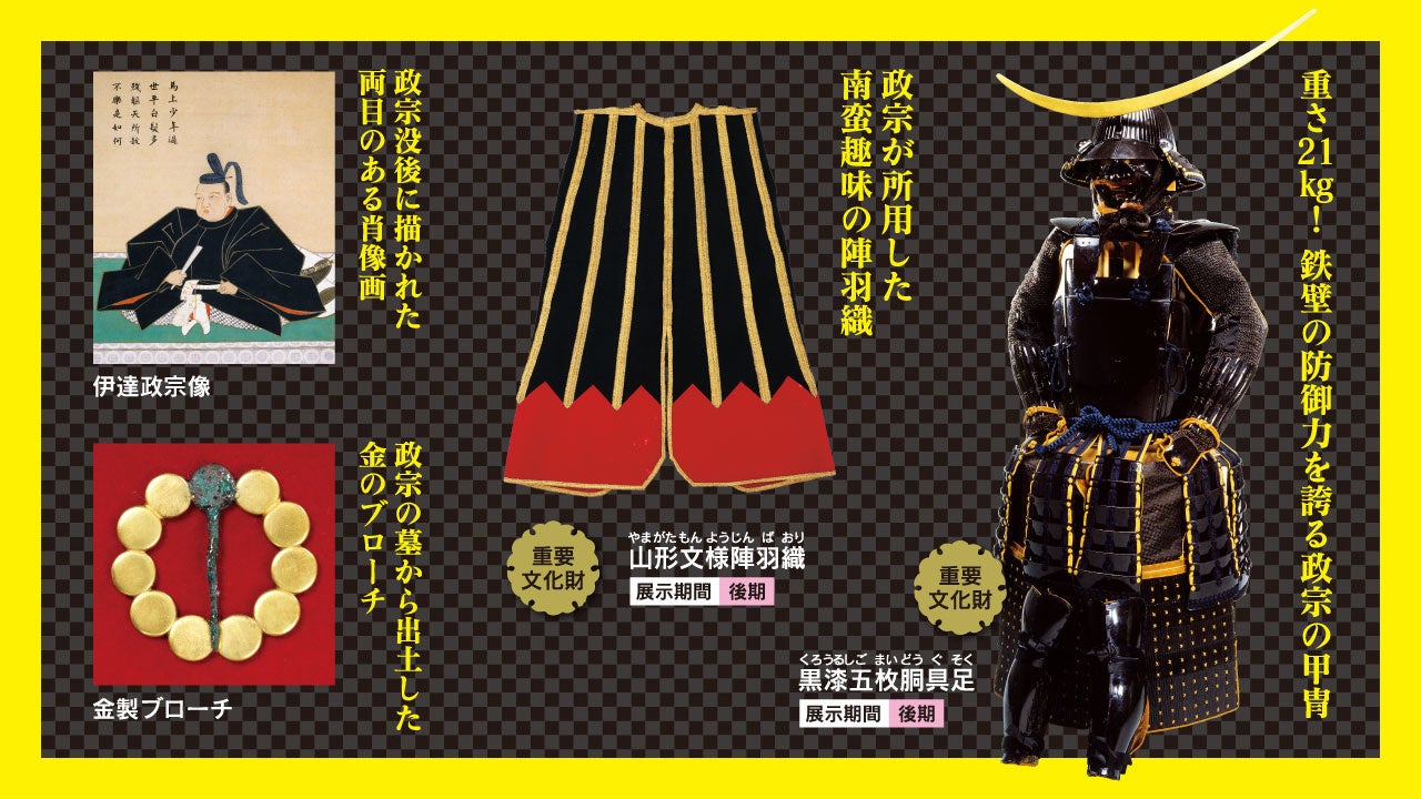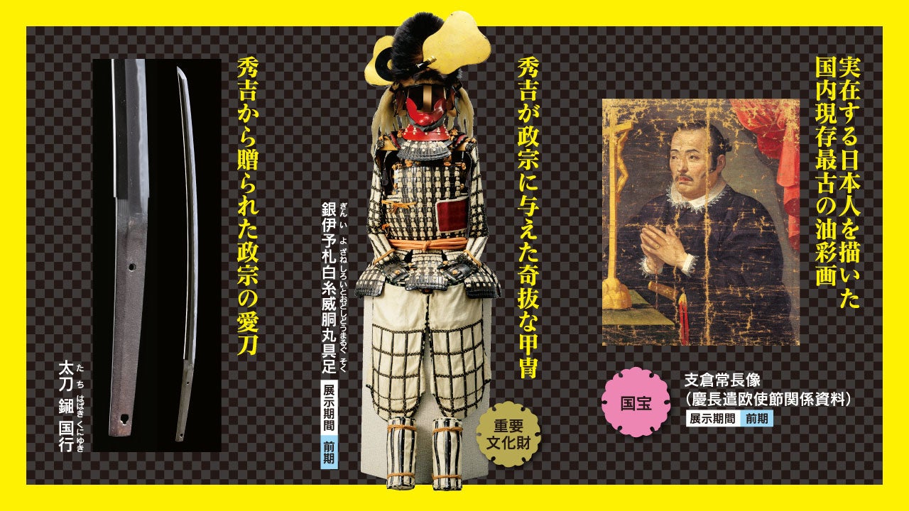 本展覧会では、こうした政宗の人柄を伝える直筆の手紙や肖像画、斬新なデザインで都びとを魅了した伊達軍団の武具・甲冑、また政宗の多才ぶりをうかがわせる書画、さらには政宗の家臣・支倉常長がヨーロッパなどから持ち帰った国宝「慶長遣欧使節関係資料」など、約100点を公開します。