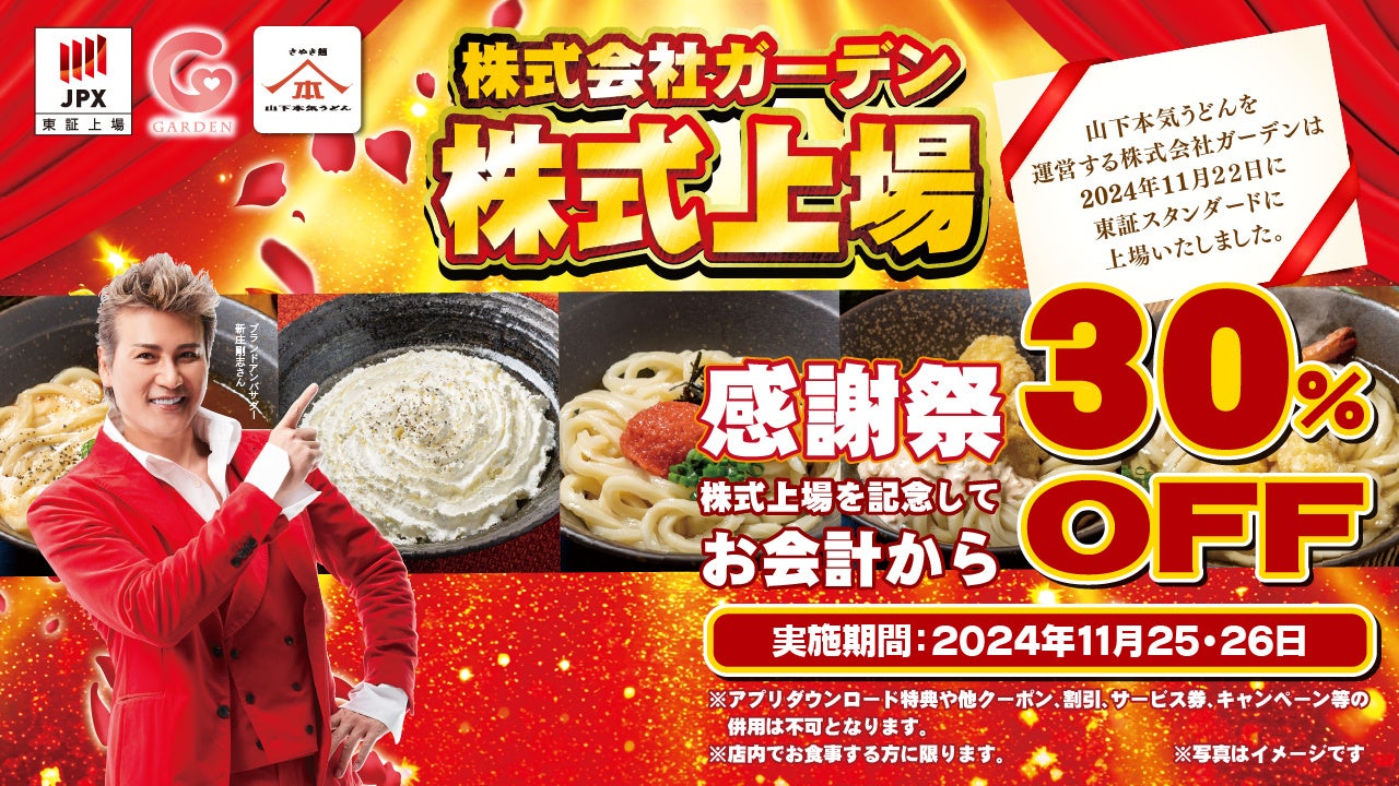 株式会社ガーデン(本社:東京都新宿区 代表取締役社長:川島賢 以下「当社」) が運営する、「山下本気うどん」は、当社の東証スタンダード上場を記念して、2024年11月25日(月)・26日(火)の2日間限定で、山下本気うどんの全商品を30%OFFにてご提供します。