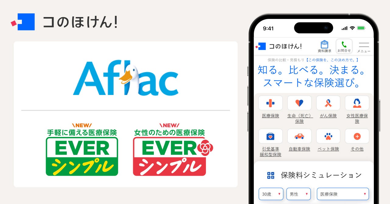 保険の一括比較・見積もりサイト「コのほけん!(https://konohoken.com/)」を運営するSasuke Financial Lab株式会社(本社:東京都千代田区、代表取締役:松井 清隆)は、アフラック生命保険株式会社(本社:東京都新宿区、代表取締役社長:古出 眞敏)の「手軽に備える医療保険 EVERシンプル」と「女性のための医療保険 EVERシンプル」の取り扱いを開始したことをお知らせ致します。