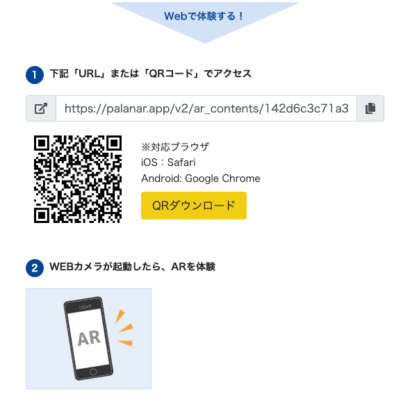 作成されたARはQRコードで簡単にシェアして手軽にWebブラウザで体験可能です。