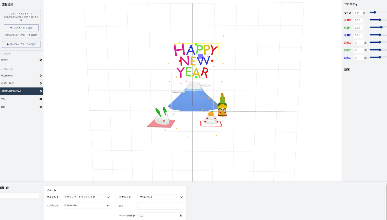 今回は年賀状用の3Dモデルとして、正月ロゴ、富士山、うさぎの3つを新しくご用意しています。