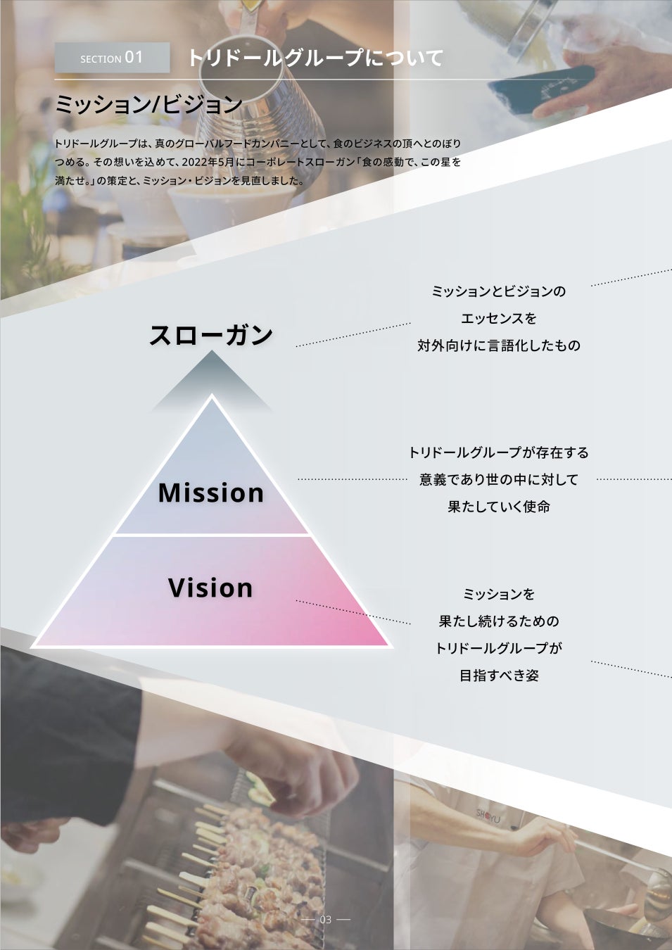 トリドールグループについてのイントロダクションとして、2022年に再定義した当社グループのコーポレート・スローガン「食の感動で、この星を満たせ。」とミッション・ビジョン、創業以来の当社グループの歩み、そして現在のスナップショットとして事業の広がりと主要ブランドのご紹介をしています。