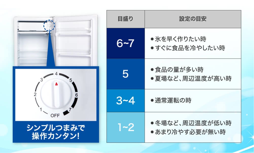 ※温度調節つまみを1~2にしておくと氷ができないことがあります。