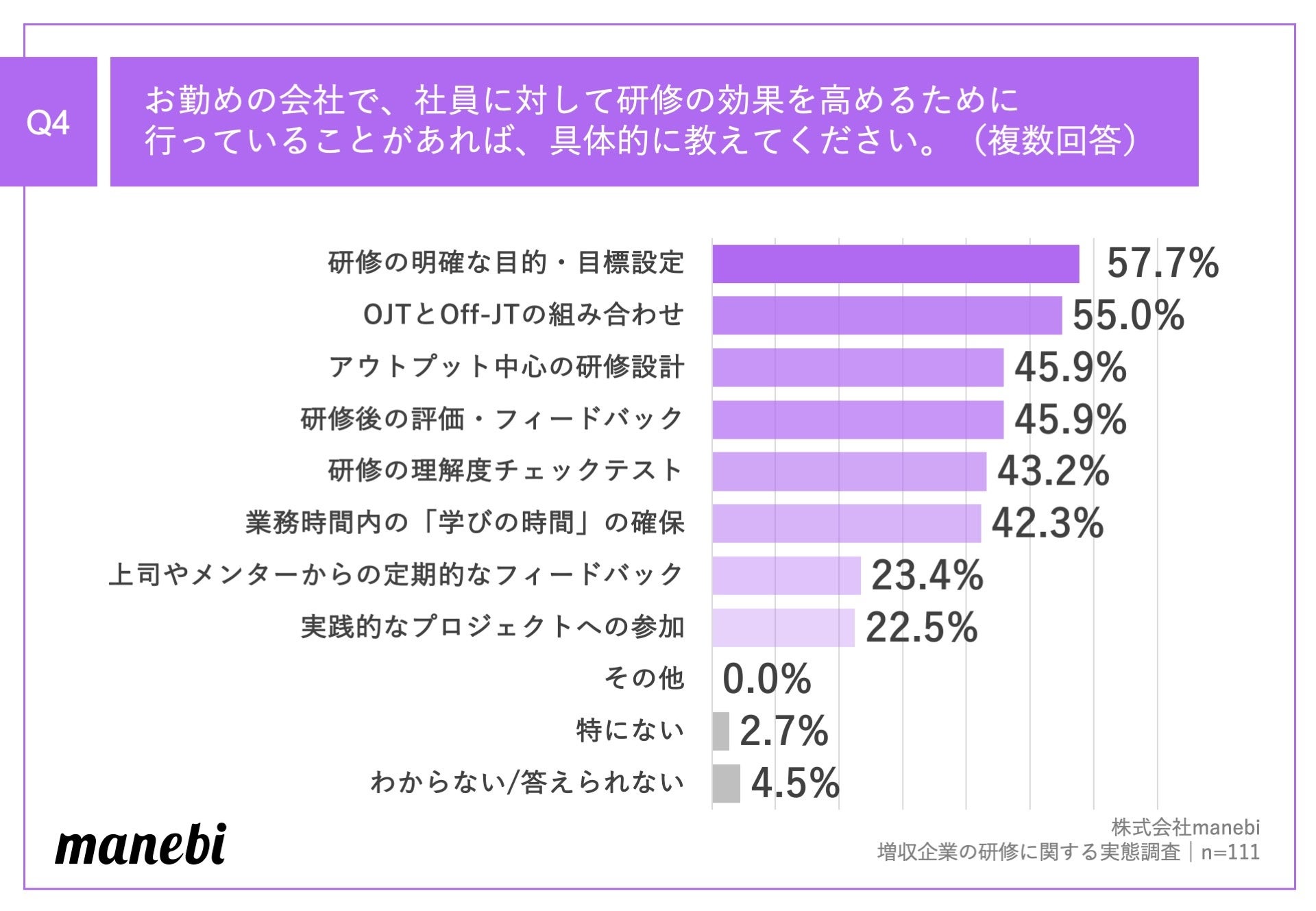 「Q4.お勤めの会社で、社員に対して研修の効果を高めるために行っていることがあれば、具体的に教えてください。(複数回答)」(n=111)と質問したところ、「研修の明確な目的・目標設定」が57.7%、「OJTとOff-JTの組み合わせ」が55.0%という回答となりました。