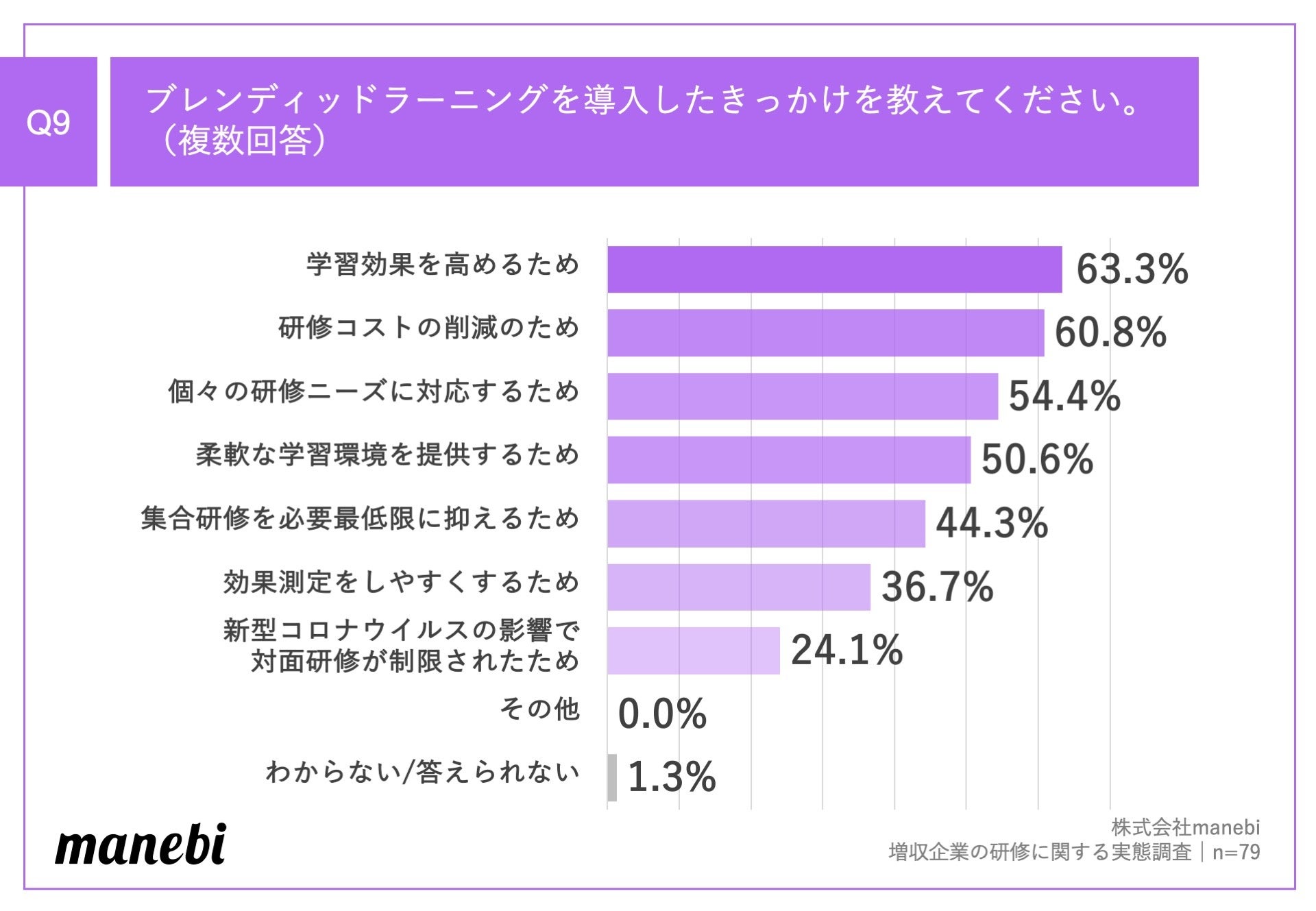 Q7で「はい」と回答した方に、「Q9.ブレンディッドラーニングを導入したきっかけを教えてください。(複数回答)」(n=79)と質問したところ、「学習効果を高めるため」が63.3%、「研修コストの削減のため」が60.8%、「個々の研修ニーズに対応するため」が54.4%という回答となりました。