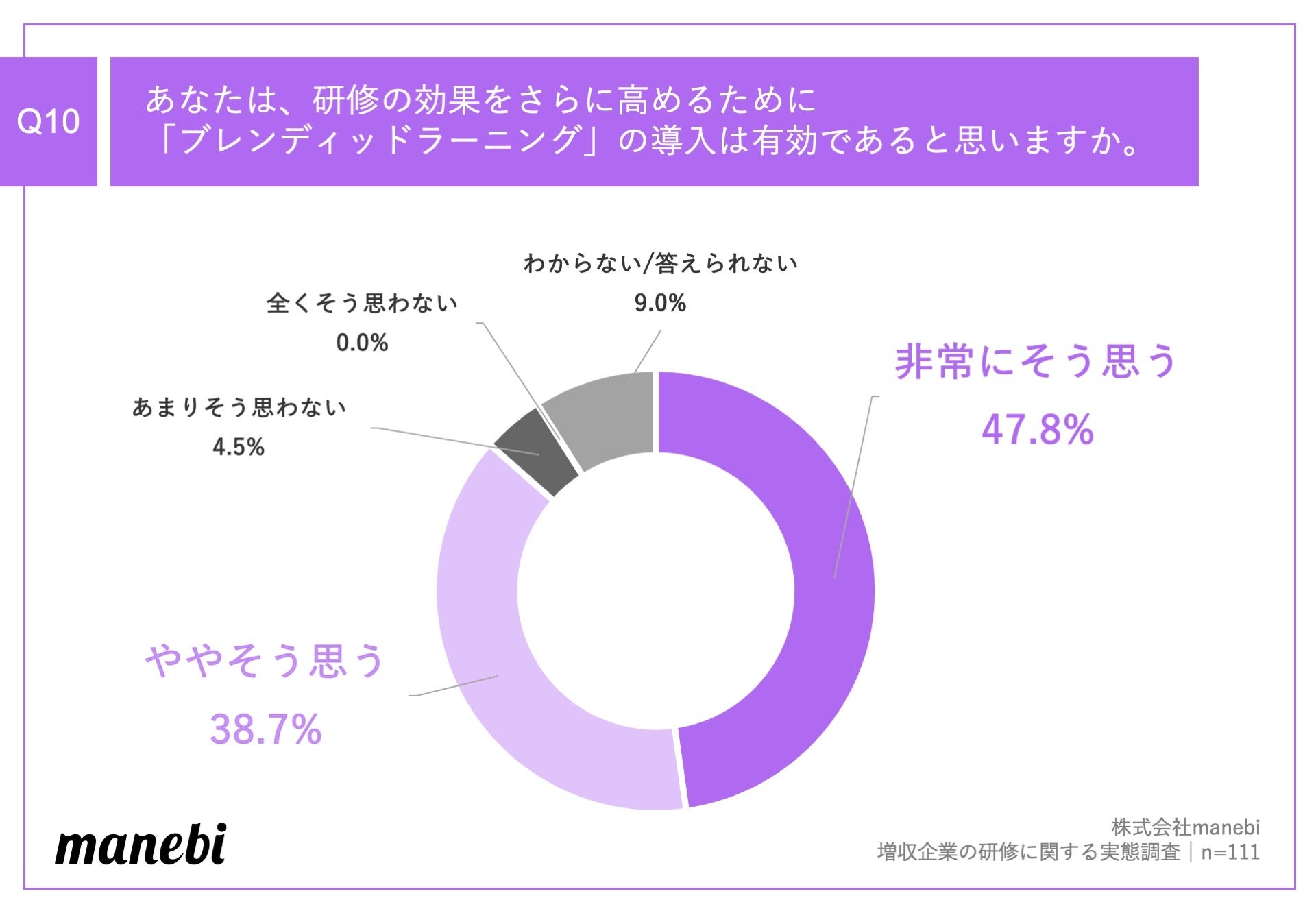 「Q10.あなたは、研修の効果をさらに高めるために「ブレンディッドラーニング」の導入は有効であると思いますか。」(n=111)と質問したところ、「非常にそう思う」が47.8%、「ややそう思う」が38.7%という回答となりました。