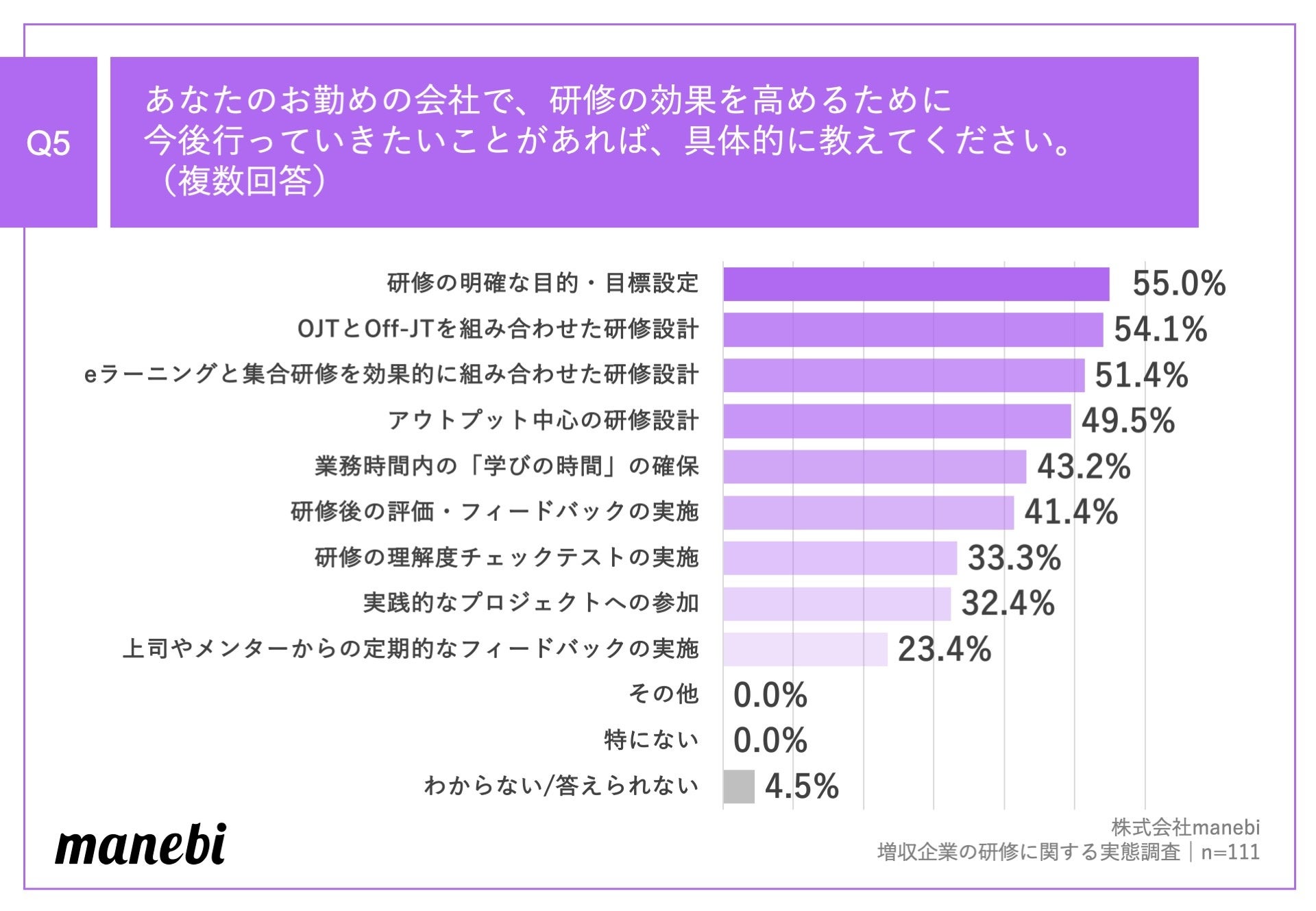 「Q5.あなたのお勤めの会社で、研修の効果を高めるために今後行っていきたいことがあれば、具体的に教えてください。(複数回答)」(n=111)と質問したところ、「研修の明確な目的・目標設定」が55.0%、「OJTとOff-JTを組み合わせた研修設計」が54.1%、「eラーニングと集合研修を効果的に組み合わせた研修設計」が51.4%という回答となりました。