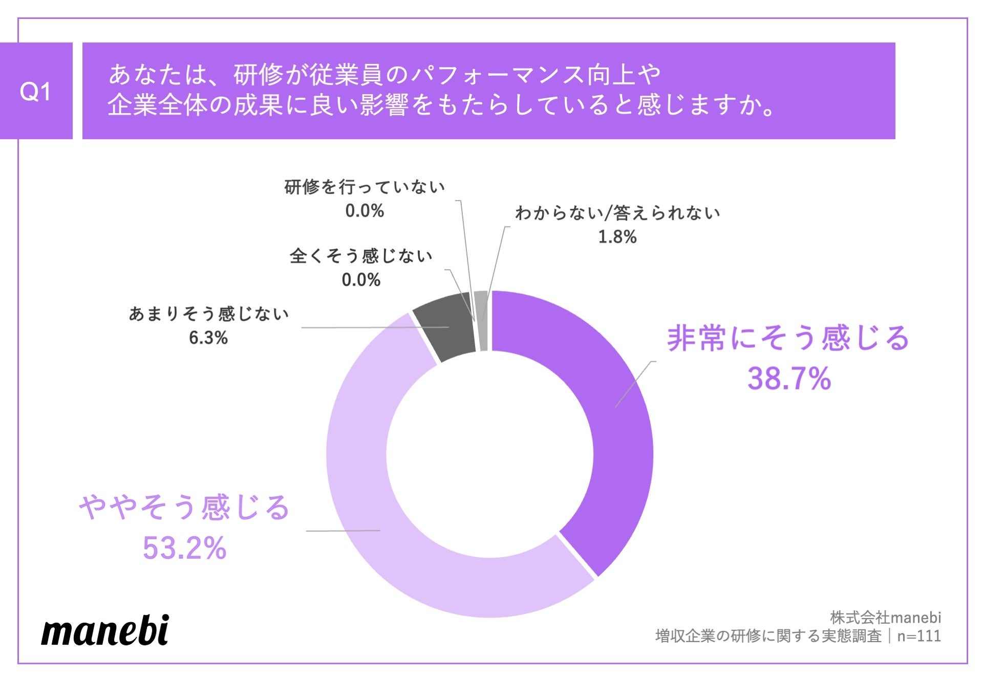 「Q1.あなたは、研修が従業員のパフォーマンス向上や企業全体の成果に良い影響をもたらしていると感じますか。」(n=111)と質問したところ、「非常にそう感じる」が38.7%、「ややそう感じる」が53.2%という回答となりました。