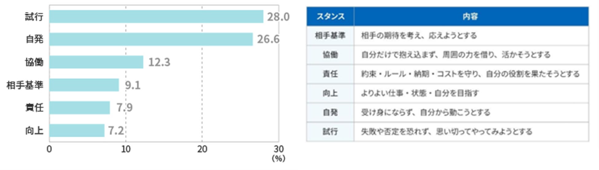 ●得意なスタンスのトップ2は「協働」(25.9%) と「相手基準」(24.9%)。苦手意識のあるスタンスのトップ2は「試行」(28%)と「自発」(26.6%)