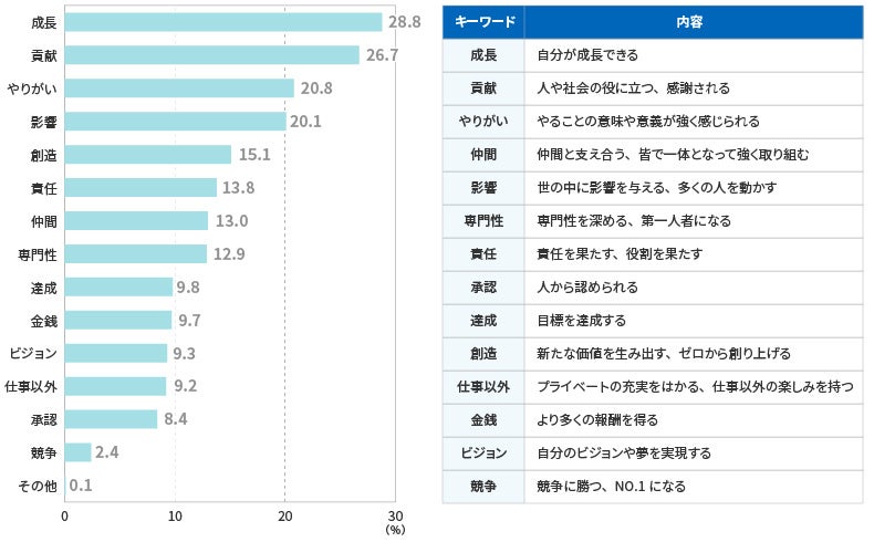 ・仕事をするうえで重視したいことは、「成長」(28.8%)と「貢献」(26.7%)がトップ2。