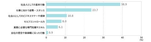 ・新入社員時代に身につけるべきことは、「社会人としての基本行動」(38.9%)が1位。