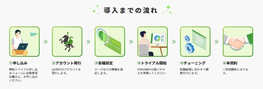 PrimeWAFは導入までのステップもカンタンです。まずは無料トライアル申し込みフォームからお申し込みいただき、トライアルでのご利用後、本契約となります。