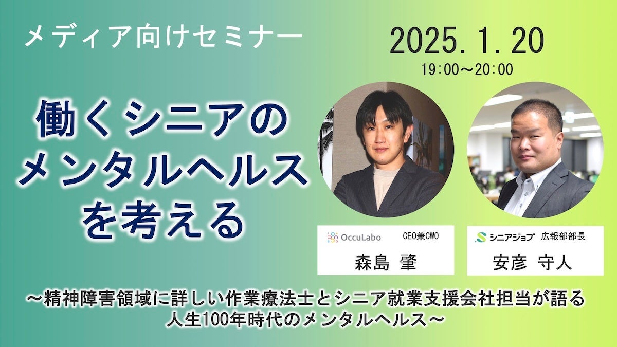シニア転職支援の(株)シニアジョブ(本社:東京都新宿区/代表取締役 中島康恵/以下、シニアジョブ)と、作業療法的アプローチから企業の人的資本経営への参画と働く人の心身をサポートする(株)オキュラボ(本社:東京都台東区/代表取締役CEO兼CWO 森島肇/以下、オキュラボ)は、2025年1月20日(月)、「働くシニアのメンタルヘルスを考える 〜メディア向けセミナー・精神障害領域に詳しい作業療法士とシニア就職支援会社担当が語る人生100年時代のメンタルヘルス〜」と題したメディア向けセミナーを開催します。
