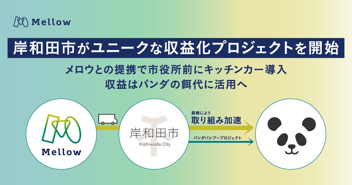 岸和田市は、これまでの取り組みを拡充し、メロウが提供する「公共空間から収益を生み出し行政内で再分配する」仕組みを活用することで「パンダバンブープロジェクト」の取り組みを加速させます。また、この新しい取り組みでは、地域の賑わい創出「行政内再分配キッチンカー事業」を開始し、事業で得た収益は「パンダバンブープロジェクト」に再分配されます。