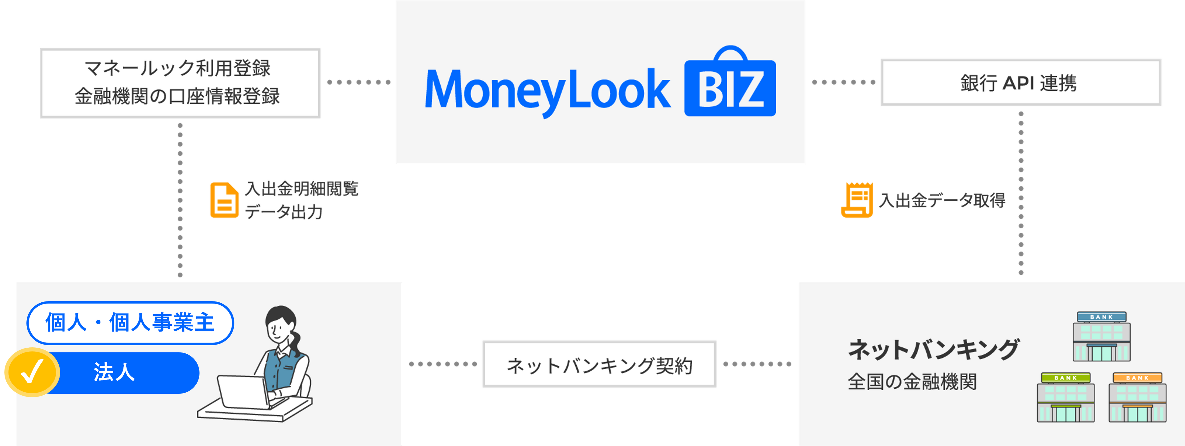 「MoneyLook BIZ」は、自社でのご利用を目的とした銀行入出金明細自動取得サービスです。複数ある銀行口座の入出金明細情報をAPI連携で自動取得して一元管理でき、また、取得したデータは「財務会計」「販売管理」「入金消込」「与信管理」などの業務システムにAPI連携やCSV出力で取り込みも可能なため、その後の入金消込や仕訳連携など煩雑な経理作業を軽減することができます。「MoneyLook BIZ」は、金融機関の明細情報と紐づくバックオフィスの管理業務を大幅に効率化できるサービスです。