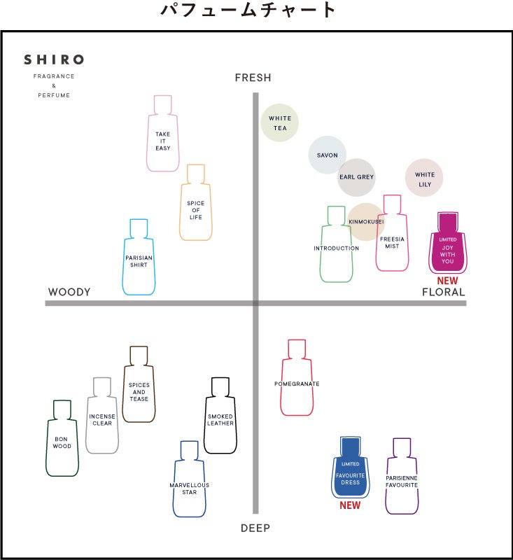コスメティックブランド「SHIRO」を展開する株式会社シロ(本社:東京都港区、代表取締役:福永敬弘)は、2022/11/12(土)に『JOY WITH YOU』と『FAVOURITE DRESS』の限定パフューム2種の香りから4アイテムずつを発売いたします。