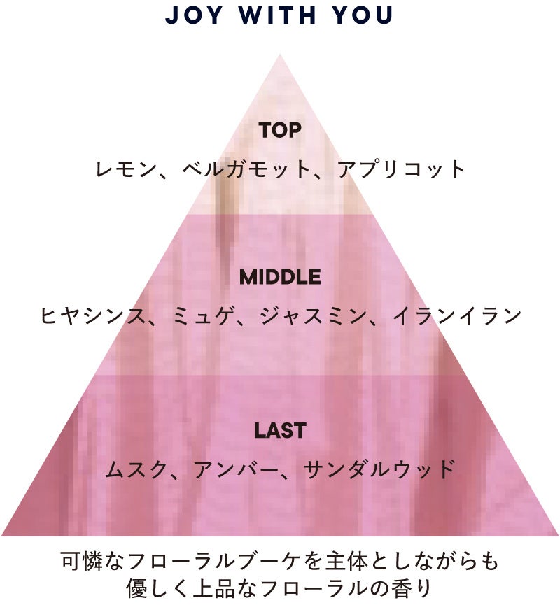小さな花が一面に咲いている花畑をイメージしたJOY WITH YOUは、ヒヤシンスやミュゲ、ジャスミンなどの優しいフローラルブーケを中心に、爽やかなレモンとベルガモット、フレッシュなアプリコットをあわせた上品な香りです。さらに、柔らかなムスクと滑らかなアンバー、サンダルウッドを加え、香りに奥行きのあるパフュームです。また、水のかわりに徳島県の木頭柚子(きとうゆず)の蒸留水*1 を配合。スキンケアアイテムの“ゆずフェイスミスト”にも配合されている蒸留水で、爽やかな香りに仕上げています。
