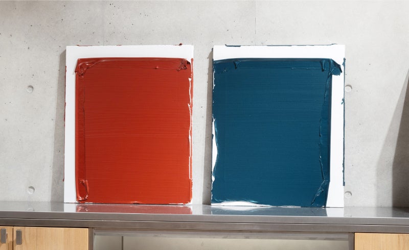 私はキャンバスに載せた絵具を剥がすというシンプルな手法で作品を製作しています。作品は窓に映る景色やそれを纏うカーテンをイメージしています。今回は2つのパフュームの香りから私自身が感じた景色とSHIROの香りに対する思いから連想した色で制作しました。香りと絵具はとても似ていて、どちらもその時の環境で香り方や見え方が変わってきます。