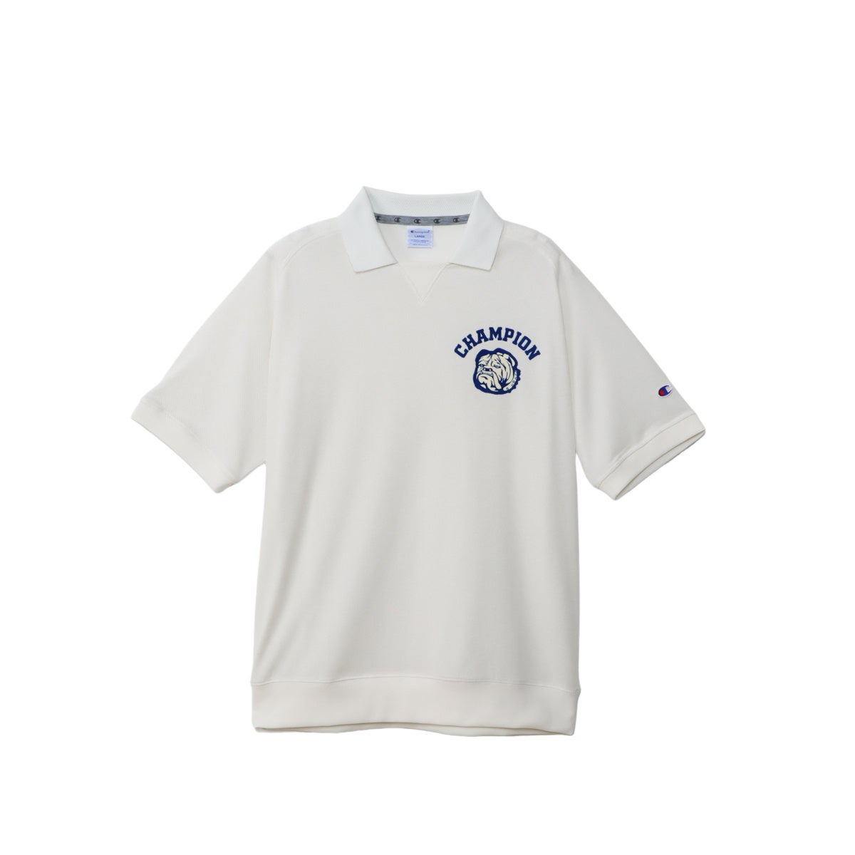 独特な杢調の表面感を持った、ドライでソフトな肌触りに、速乾性、UVカット機能も備えた素材を使用したショートスリーブポロシャツです。しわが寄りにくい特殊な凹凸のある糸を採用しています。身幅、肩幅にゆとりを持たせた、着慣れた感覚で着用できるリラックスフィット。肩や腕の動きがスムーズで、脱ぎ着がしやすい独特な形状のラグランスリーブです。裾のリブをタックアウトすることで通気性の確保ができるので、暑い時期でもより快適にプレーが楽しめます。襟裏は通気性を高めるメッシュ構造。ヴィンテージスウェットシャツに見られる襟元のガゼットによって首周りの伸縮性を高め、脱ぎ着がしやすい特長も持っています。左胸にカレッジイメージの書体を使った「CHAMPION(チャンピオン)」と、犬のイラストを組み合わせたグラフィックをフロッキープリントで入れています。