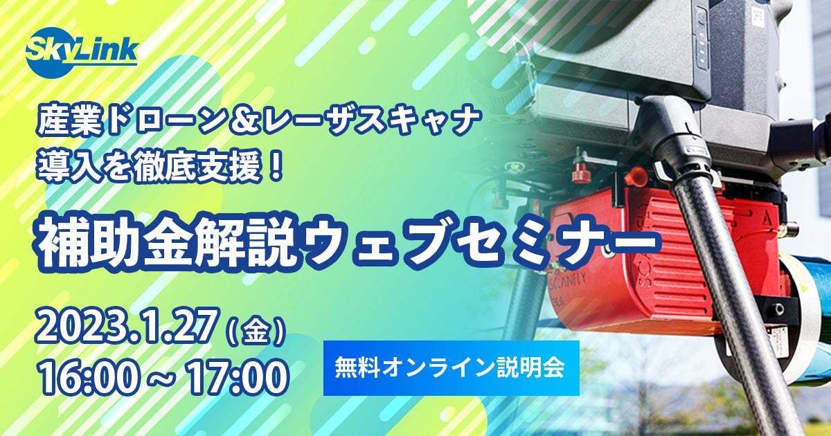 ドローンの販売や産業向けソリューションを展開する、SkyLink Japan(株式会社WorldLink & Company 本社:京都市北区、代表取締役社⻑:須⽥信也)は、1/27(金)に『産業ドローン&レーザスキャナ導入を徹底支援!補助金解説ウェブセミナー』と題したオンラインセミナーを実施します。