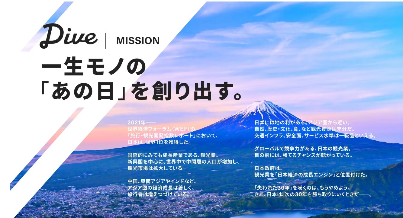 ダイブは、日本経済の成長エンジン「観光」の大課題を解決すべく、事業展開しているベンチャー企業です。