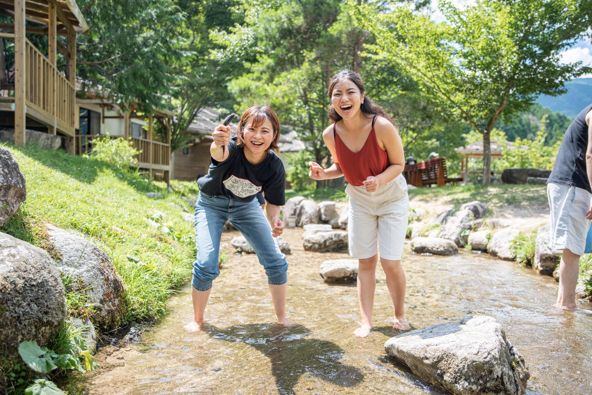 施設横に流れる落合川では、「渓流釣り」「つかみどり」を体験いただけます。釣具の貸し出しや餌の販売も行っているので、手ぶらで行っても大丈夫。
