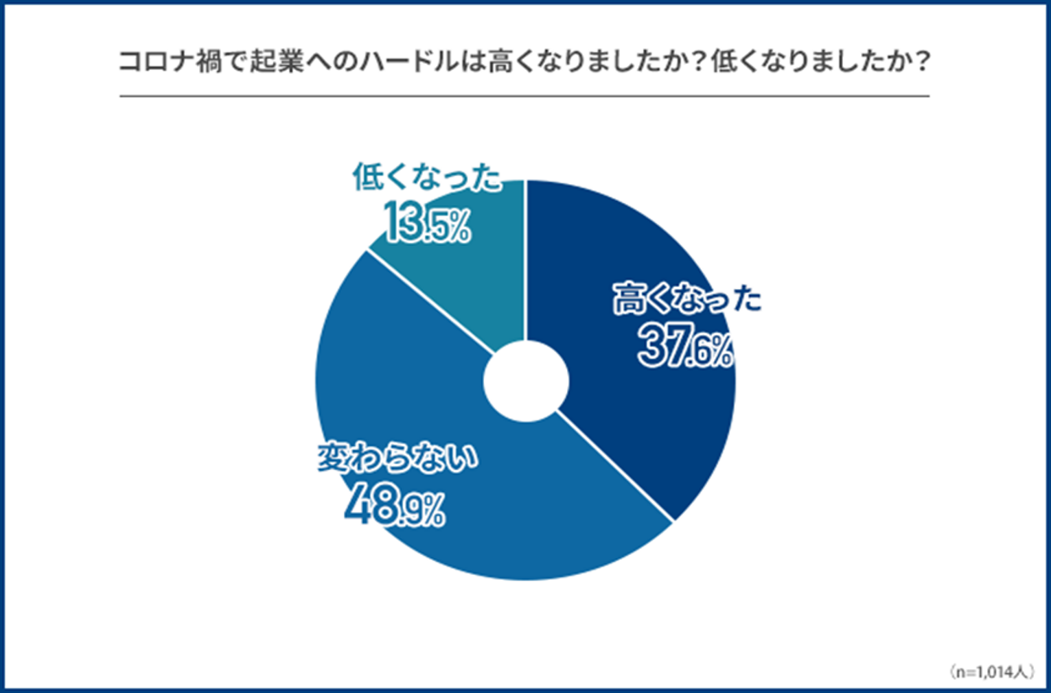 コロナ禍で起業することに対するハードルの変化を聞いたところ、「高くなった」(37.6%)、「変わらない」(48.9%)、「低くなった」(13.5%)となりました。