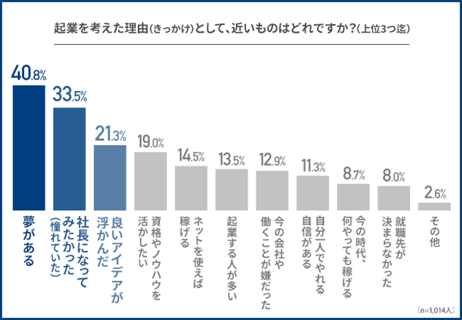 ・起業を考えた理由 1位「夢がある」、2位「社長になってみたかった」、3位「良いアイデアが浮かんだ」