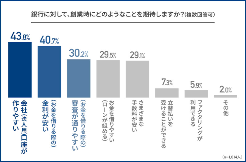 ・銀行に対して最も期待することは「会社(法人用)口座が作りやすい」の43.8%、以降「(お金を借りる際の)金利が安い」40.7%、「(お金を借りる際の)審査が通りやすい」30.2%と続く