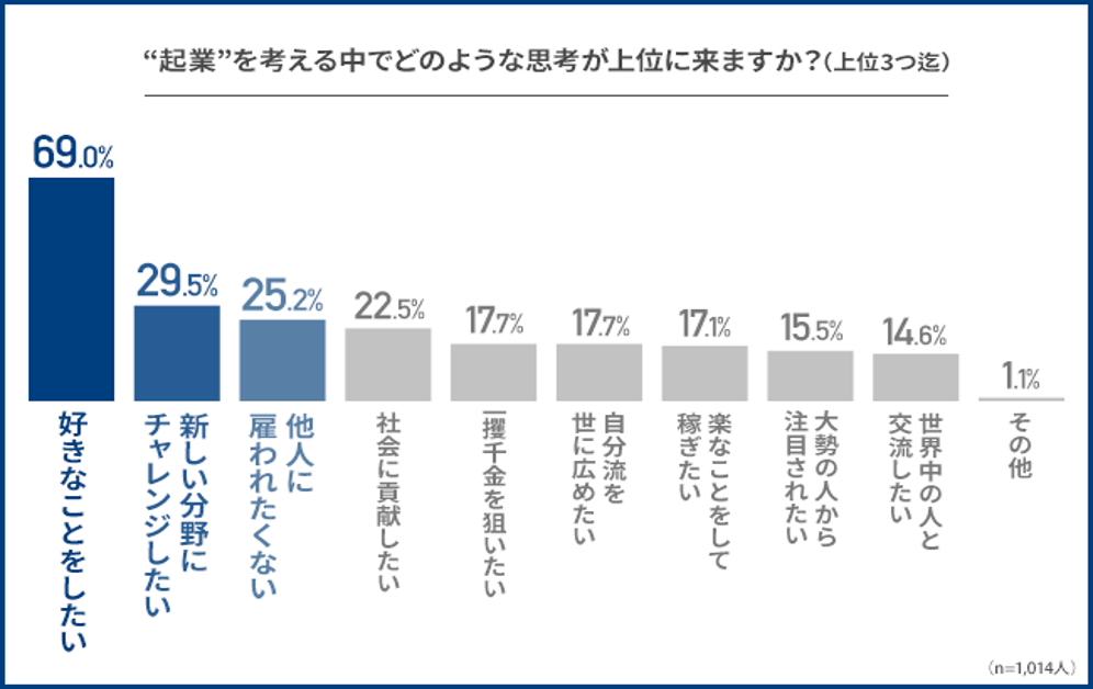 ・起業に対する思考で最も多いのは69.0%で1位の「好きなことをしたい」、以降2位「新しい分野にチャレンジしたい」(29.5%)、3位「他人に雇われたくない」(25.2%)と続く