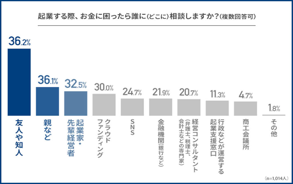・相談先で最も多いのは「友人や知人」の36.2%、「親など」36.1%、「起業家・先輩経営者」32.5%と続き、「金融機関(銀行など)」21.9%も6位にランクイン