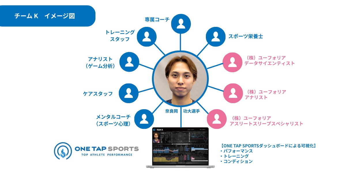 今回サポートを開始する「チームK」(Kodaiの「K」)には、データプラットフォームとしてONE TAP SPORTSを活用し、ユーフォリア所属の運動生理学や睡眠、データ分析の専門スタッフが参画。選手本人、監督に加え、複数の専門スタッフ(メンタルコーチ:スポーツ心理、アナリスト:ゲーム分析など)が協働する「チーム K」が始動します。