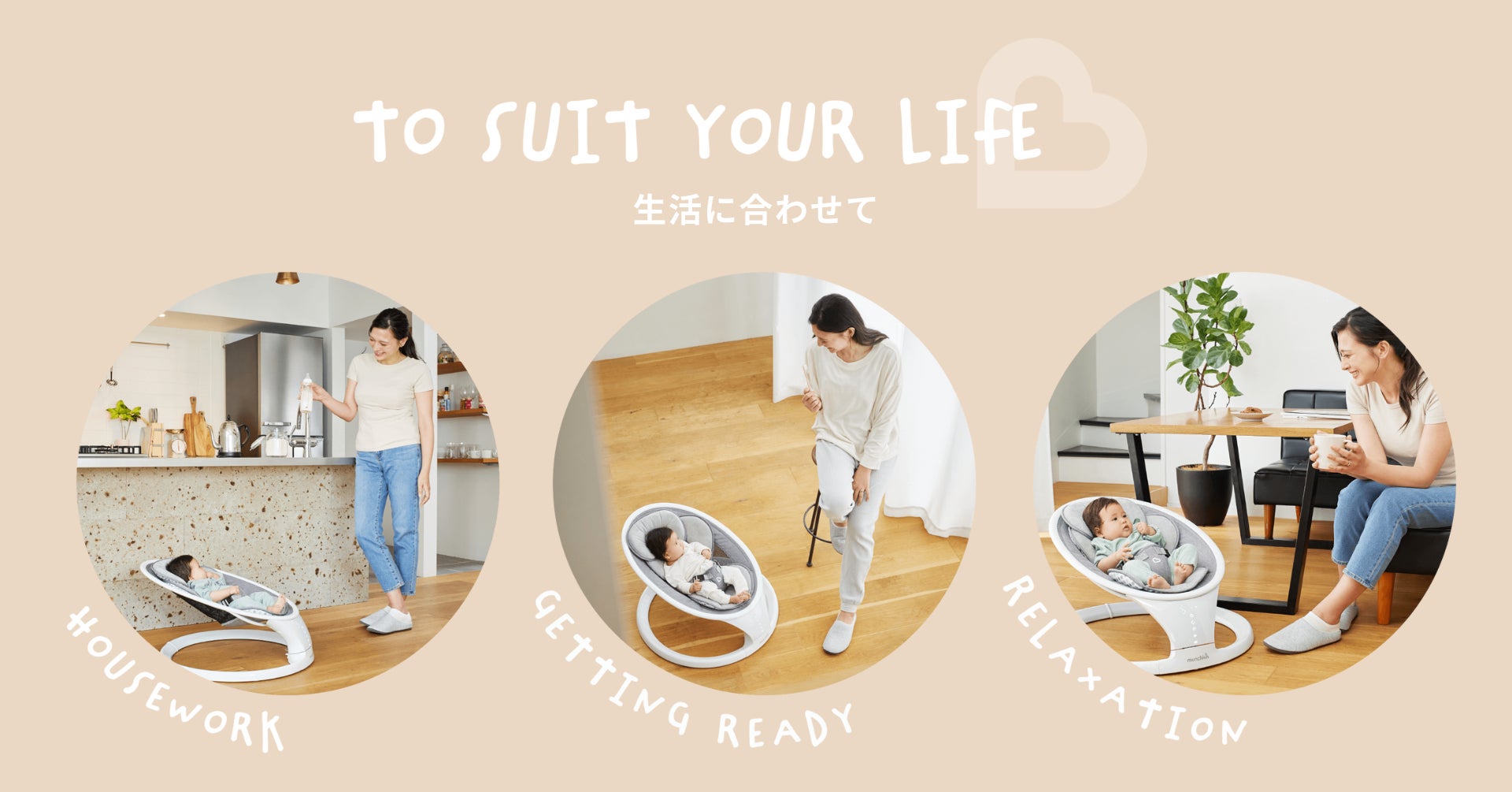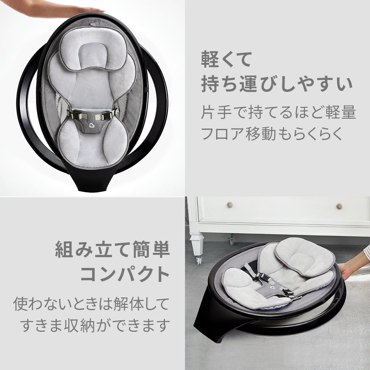 育児に時間と心のゆとりをもたらす電動ベビースウィング。2022年の発売以降、多くのファミリーの育児を支えてきました。その魅力は、抱っこされているかのような自然な左右の揺れ、お気に入りのサウンドを流せるBluetooth®対応、移動も楽々の軽量でコンパクトなボディといった高い機能性。インテリアに合わせて選べるブラック・ホワイトの2色展開により、よりスマートな子育てライフを提案します。