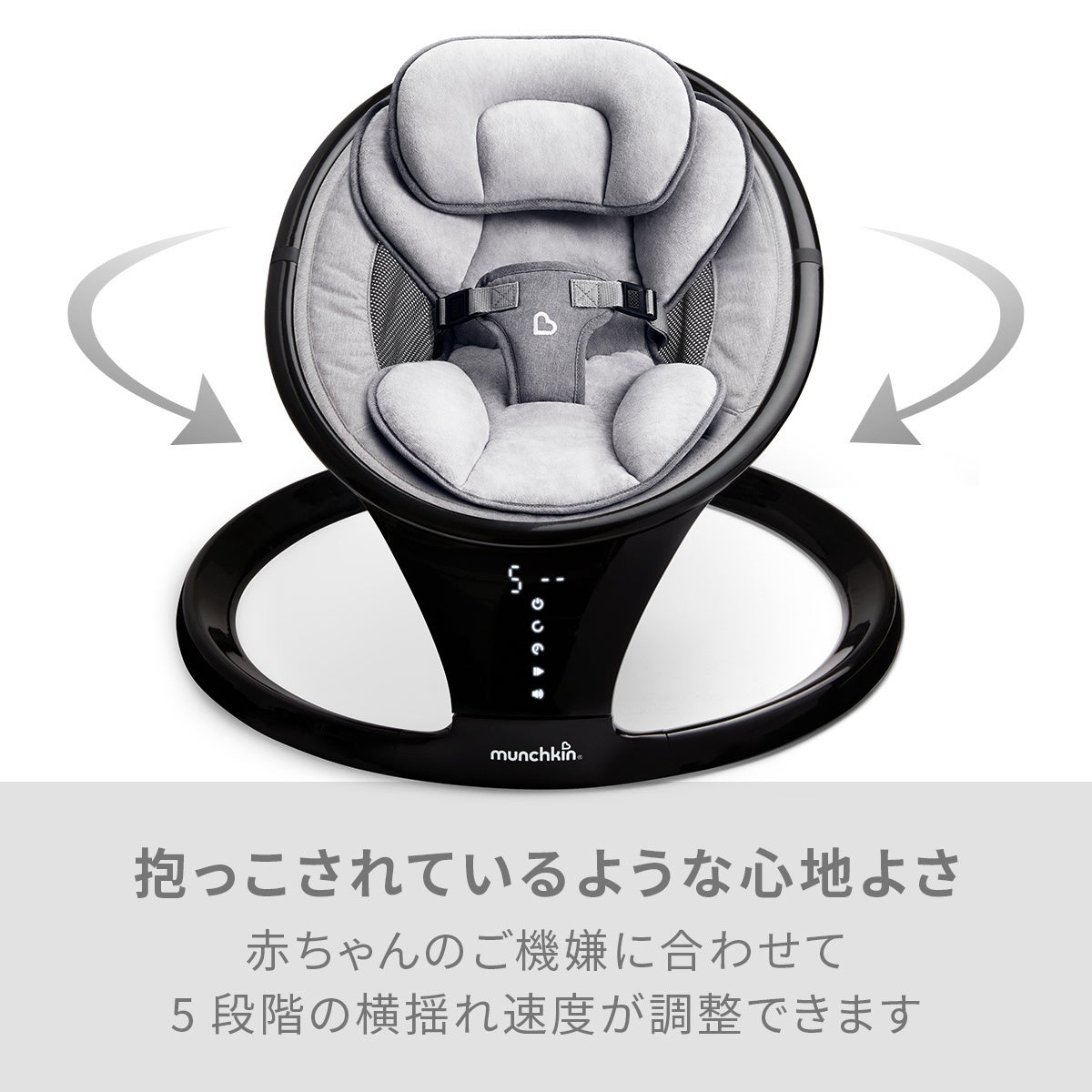 5段階の電動スウィング機能で自然な左右の揺れを再現。赤ちゃんの好みに合わせて調節ができます。