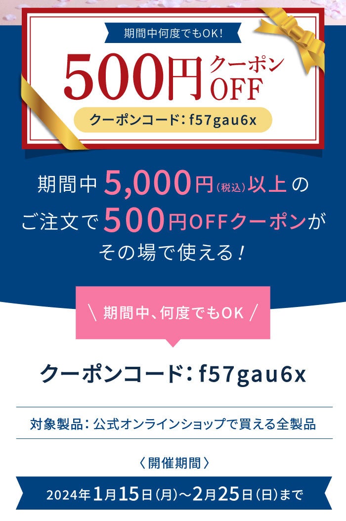 5,000円(税込)以上のご注文で、その場で使える「500円OFFクーポン」をプレゼント!2月25日(日)までの期間、何度でもご使用いただけます。