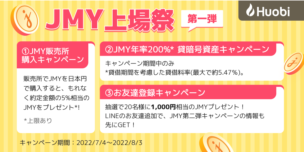 フォビジャパン株式会社(所在地:東京都港区、代表取締役社長:関 磊、以下「フォビジャパン」)は、JMYの取扱いを7/4(月)より開始いたします。JMY新規上場により、Huobi Japanの取扱銘柄数は22種類となります。こちらを記念し、【新規上場記念】JMY上場祭を実施いたします。