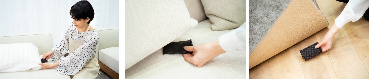 一般的なダニ対策とされる掃除機かけや天日干し、洗濯などは一部のダニの死がいやフンを取り除くだけで、その発生源である生きたダニには効果がありません。また、ダニの生態を考えると、それまでの2Dダニ捕りシートやダニよけでは完全なダニ対策になっていませんでした。『さよならダニー』は、コンパクトサイズのシートを寝具やカーペット、ソファなどダニが気になる場所に置くだけで、ダニを効率的に捕獲し、そのまま捨てることができる3D構造のダニ捕りシートです。殺虫成分不使用で、アレルギーをお持ちの方や、赤ちゃん、ペットのいるご家庭でも安心してダニ対策が可能です。
