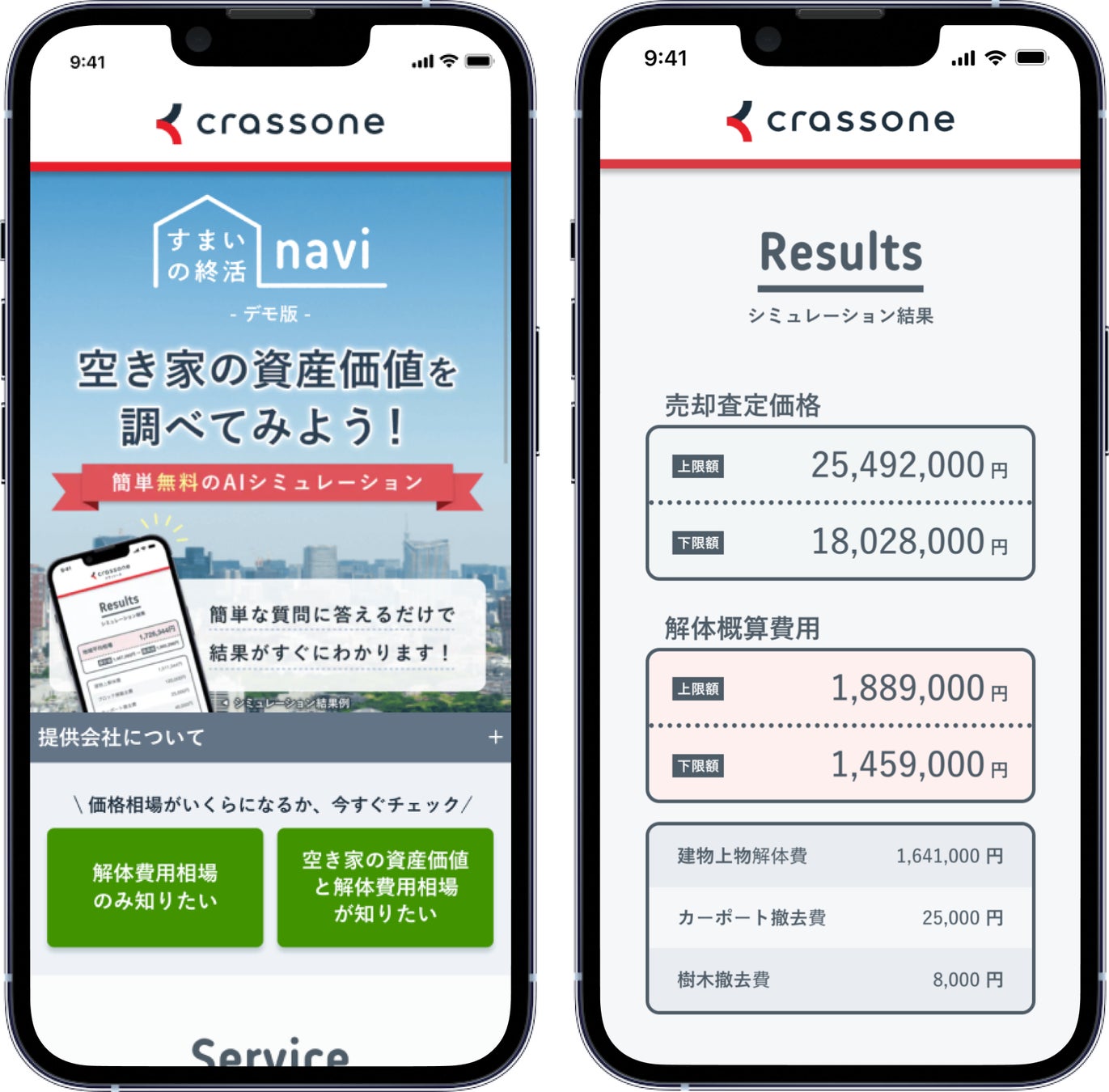 スマートフォン等から土地建物の面積や最寄り駅、接する道の幅などの条件を入力することで、「解体費用」と解体後の「土地売却査定価格」の概算額を手軽に無料で把握することができ、「解体費用がどのくらいか分からない」といった情報不足の解消や、解体後の土地売却の見通しが立たないために空き家の解体に踏み切れない所有者の意思決定の後押しを行います。概算費用を把握したうえで、具体的な見積もりを希望する場合は、解体工事のマッチングプラットフォーム「クラッソーネ」により工事会社の紹介を受けることもできます。