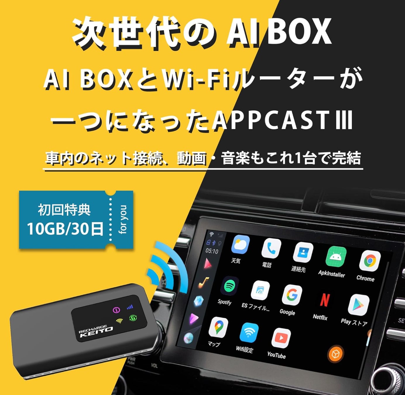APPCASTⅢ エーピーピーキャスト3 車でYouTubeが見られてインターネットも使える CarPlay Ai Box クラウドSIM搭載 10ギガ付き AN-S129