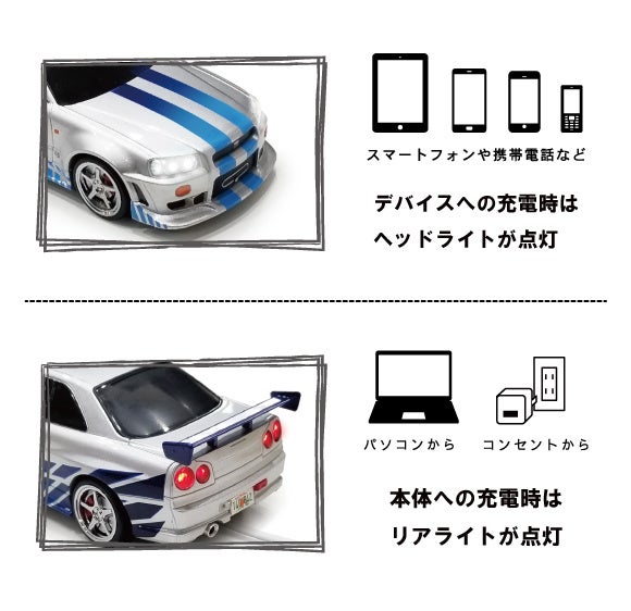 CAMSHOP.JP(https://camshop.jp/?pid=165598034)より、自動車型モバイルバッテリー「日産スカイライン GT-R (BNR34) ワイルド・スピードX2 ブライアン仕様」が販売されます。映画『ワイルド・スピードX2』(2 Fast 2 Furious)に登場するR34を再現。日産自動車㈱、NBC Universal Entertainment 公認の世界初、日本限定のライセンス商品です。