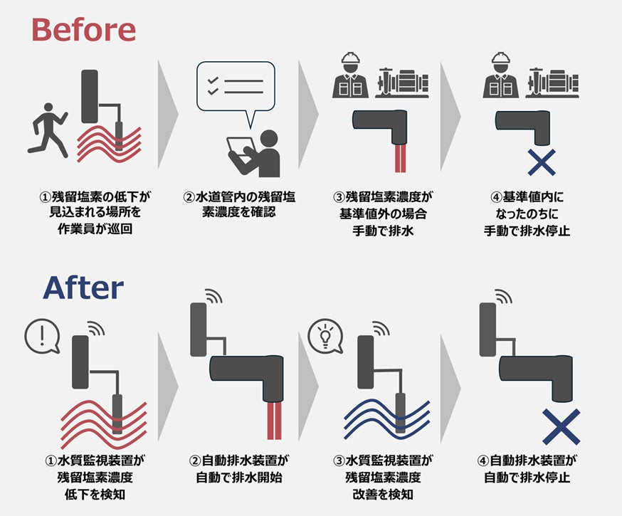 これにより、排水作業を行う水道事業者の負担が軽減するとともに、残留塩素濃度が一定に保たれた安全な水の供給ができるようになり、どの地域においても水を必要以上に無駄にすることがない持続可能な上水道を実現します。