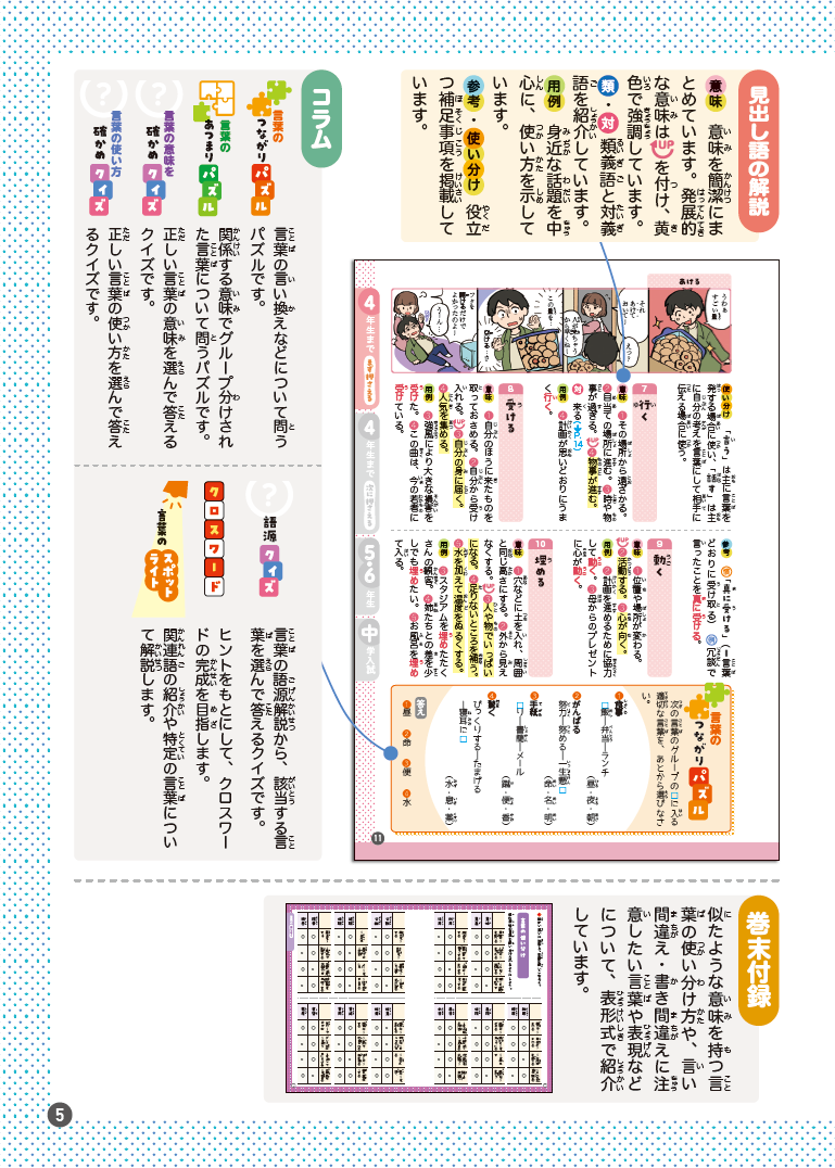 「参考」や「使い分け」など、一歩進んだ説明も加え、ことばを使ったパズルなどのコーナーも用意しています。